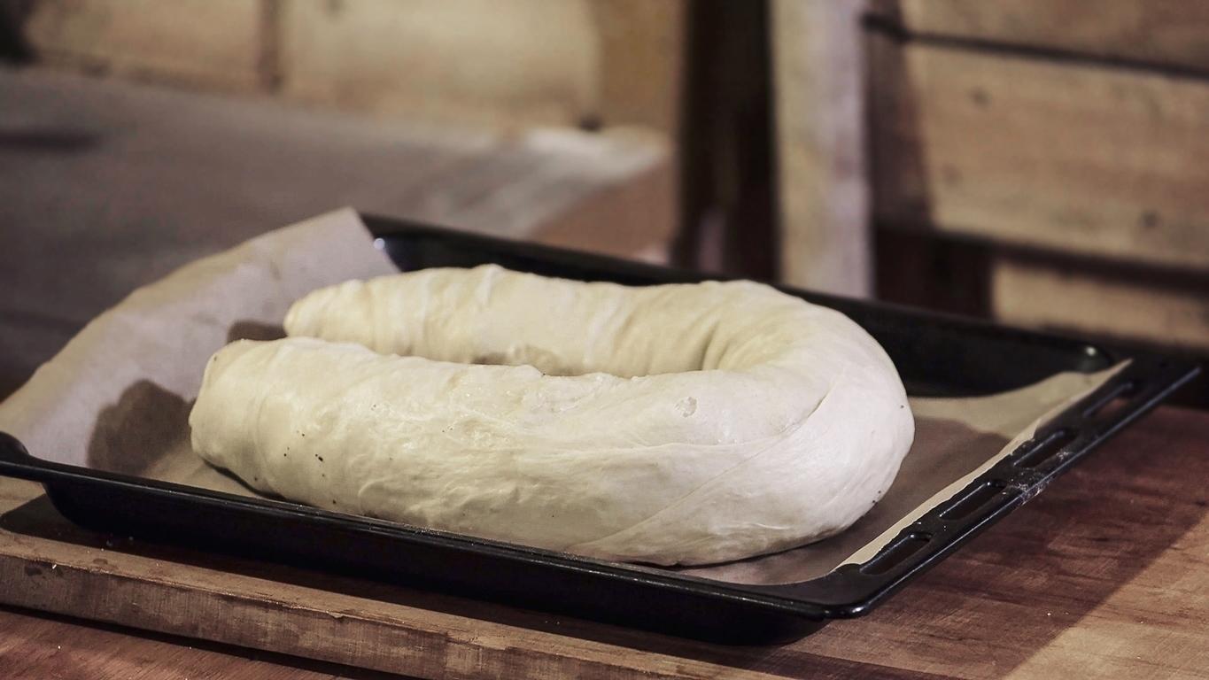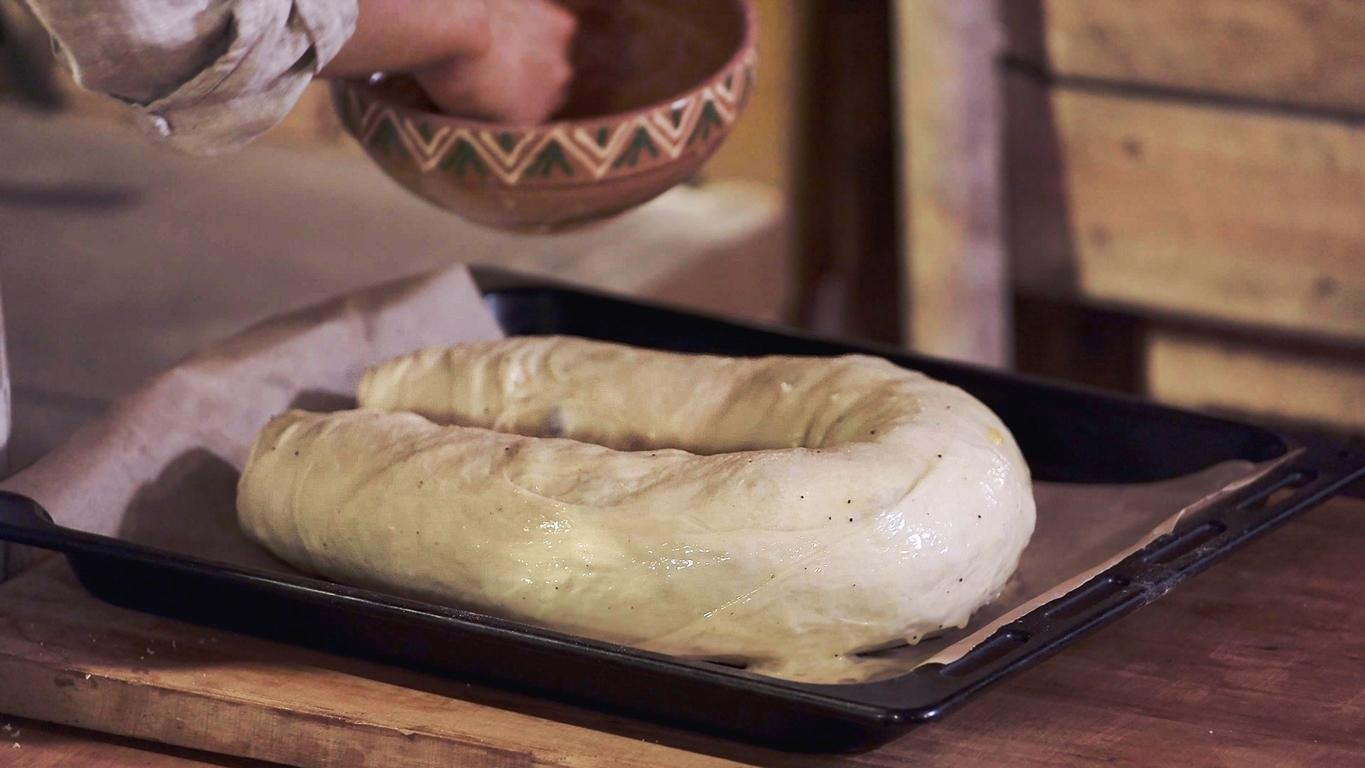 Then form a circle and put on a baking sheet lined with baking paper. Sprinkle with the whipped egg and bake for 40-50 minutes at a temperature of 200 °C until a golden crust is formed. Remove the baking from the stove, sprinkle with powdered sugar.
