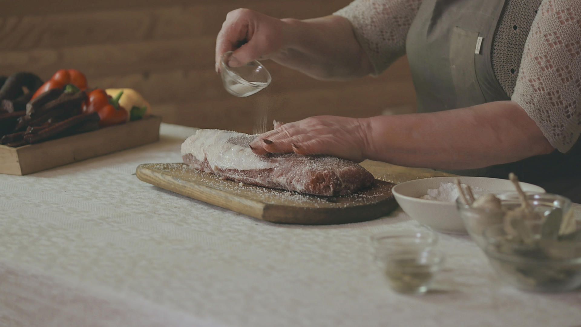 Rub pork tenderloin with spices – bitter and fragrant pepper, rubbed bay leaves, sugar, garlic, mint leaves and salt.